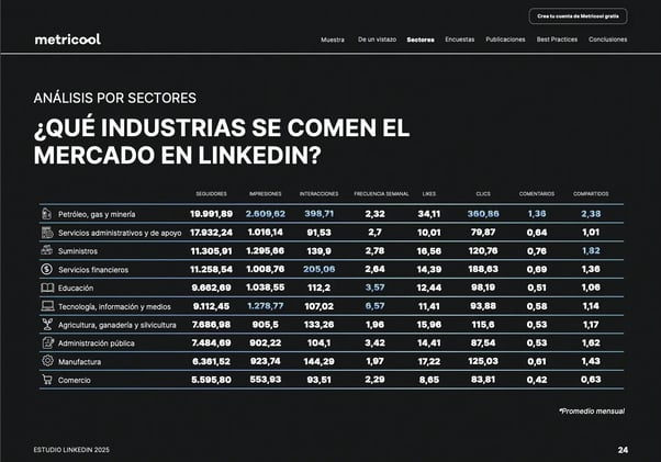 Manufactura y utilities, con audiencias más pequeñas, destacan por su alto engagement relativo.